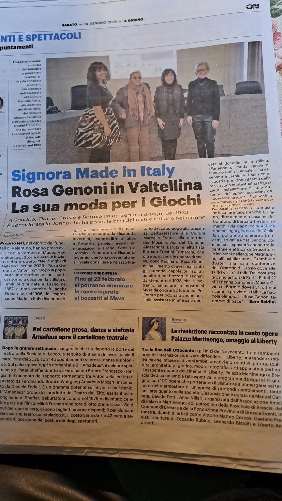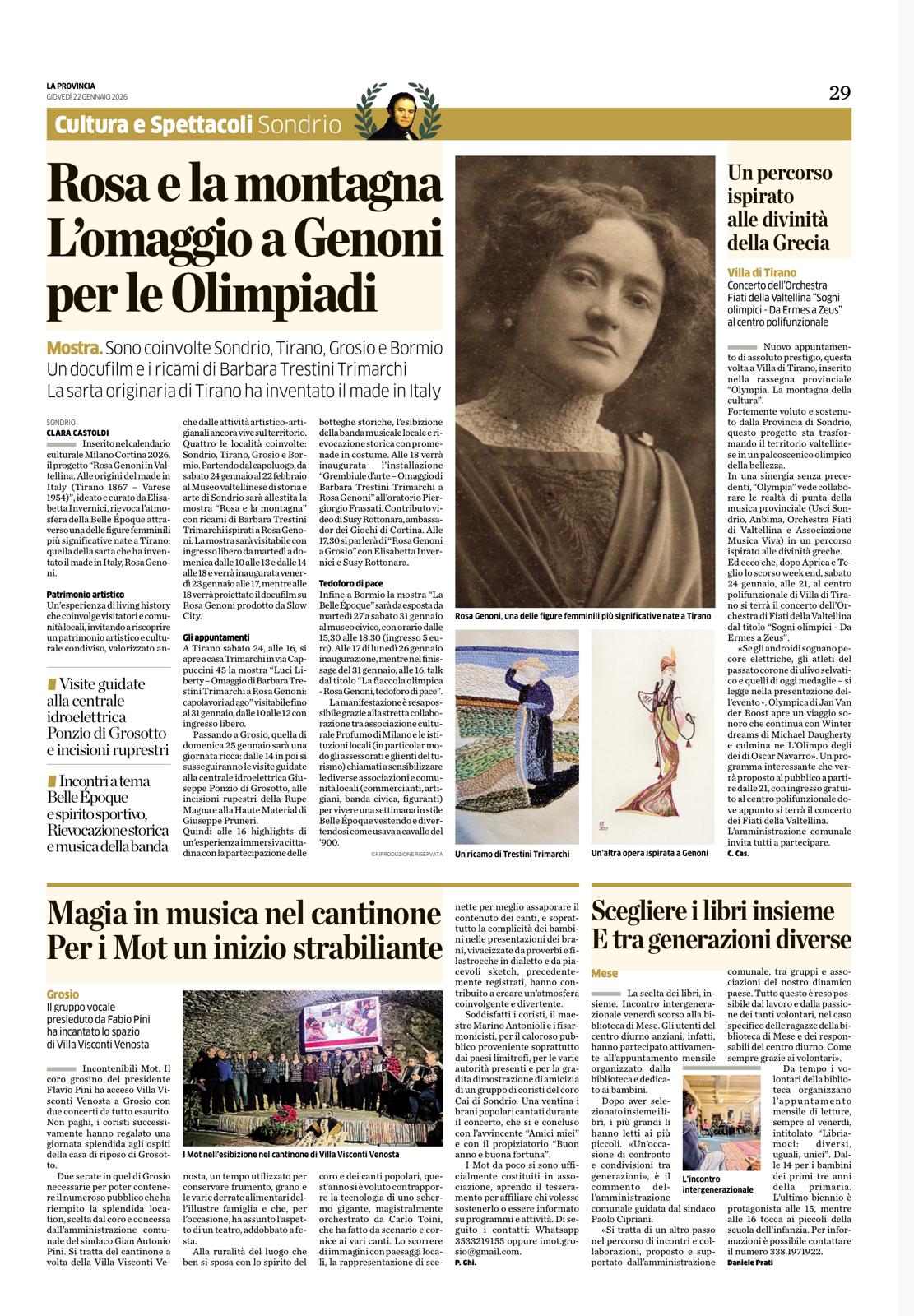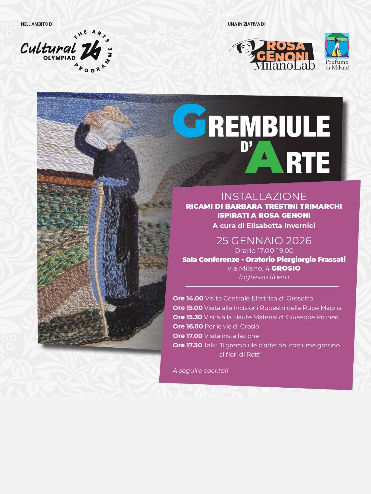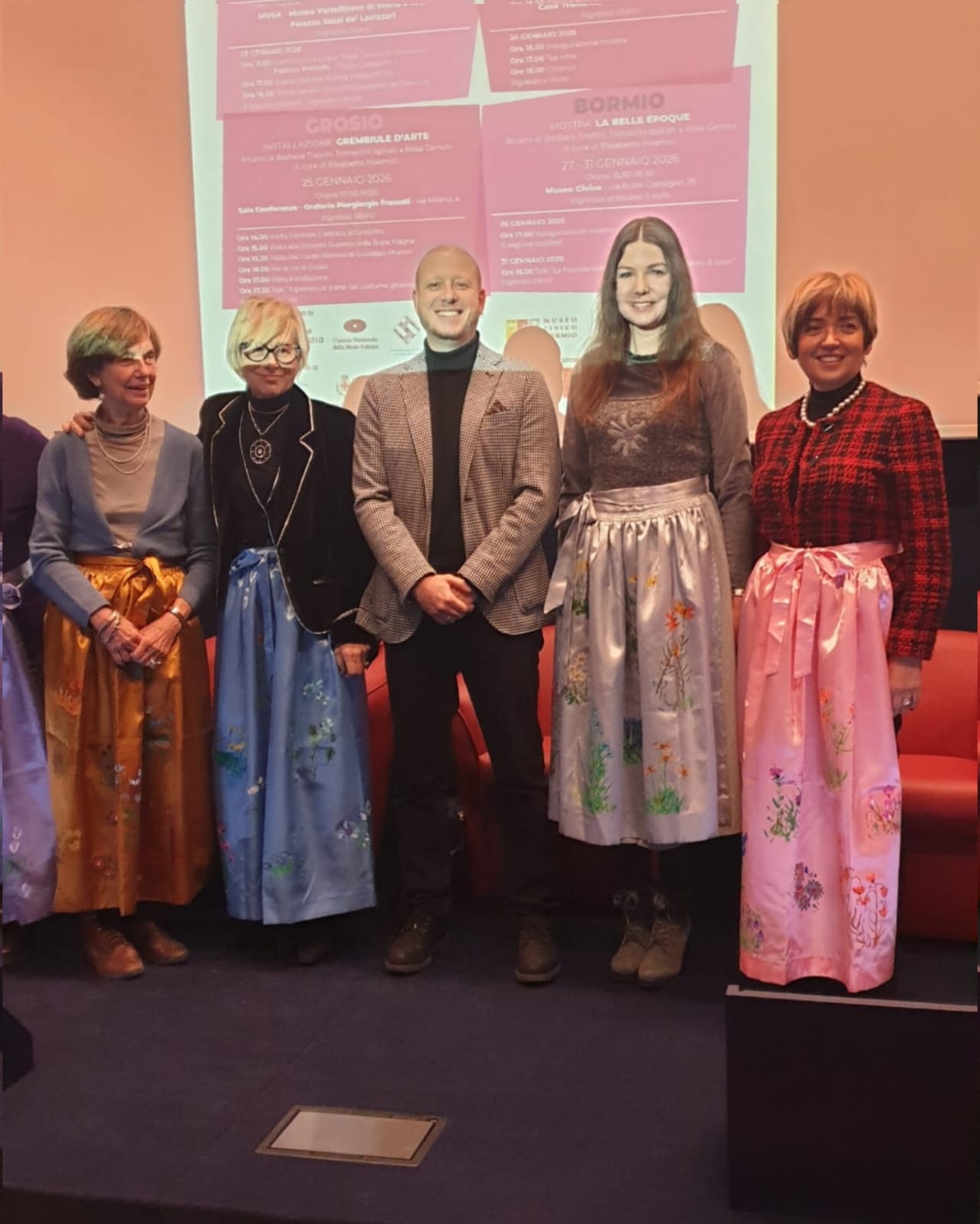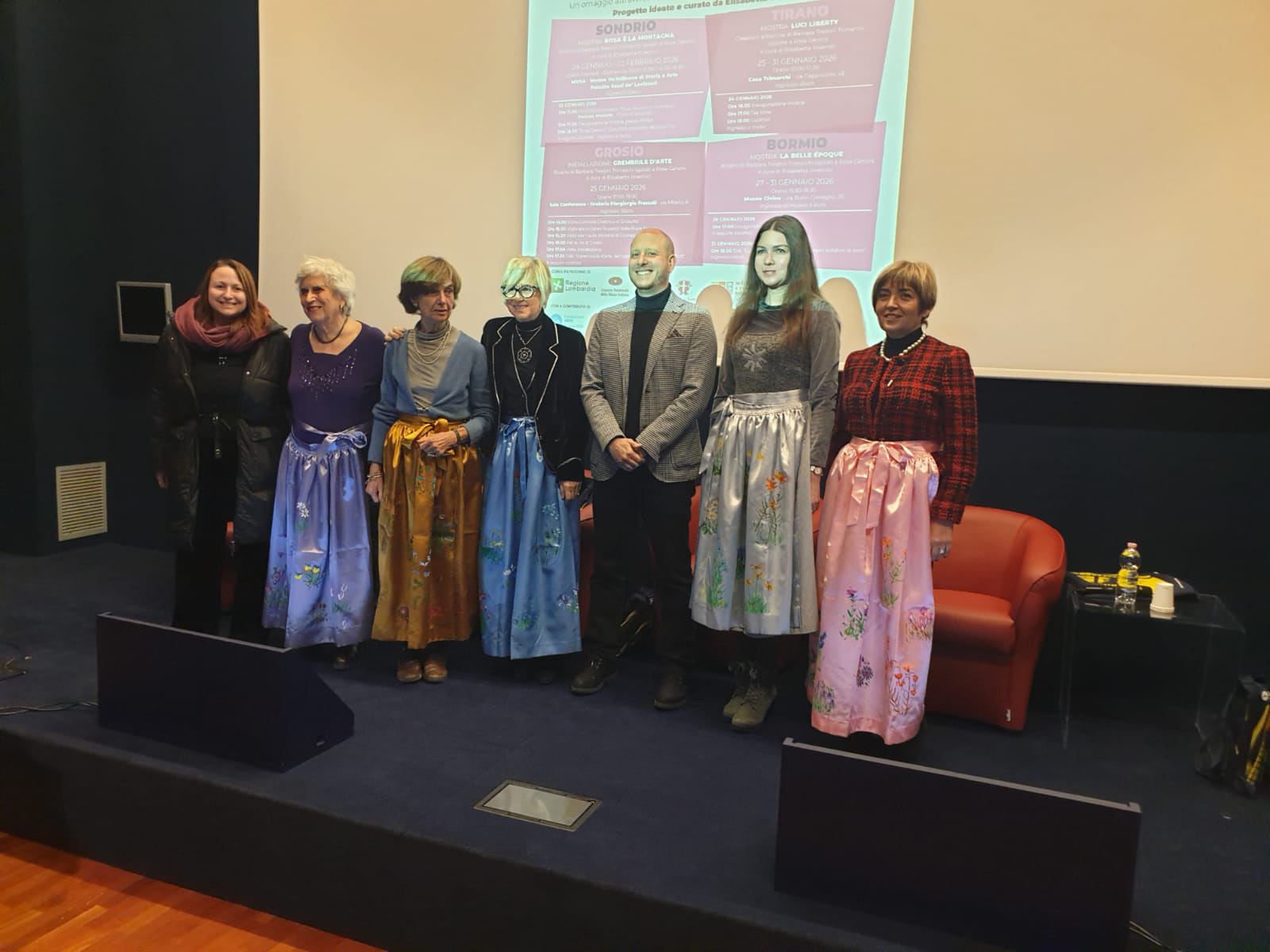 Susy Rottonara and the art aprons by ROTT with the installation of the Ladin legend of the Dolomites Merisana and the enchantement of flowers  ambassadors of the Cultural Olympiad d Milano Cortina 2026 within the festival Rosa Genoni in Valtellina
