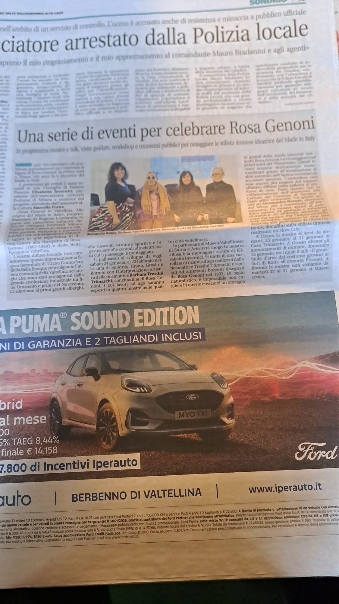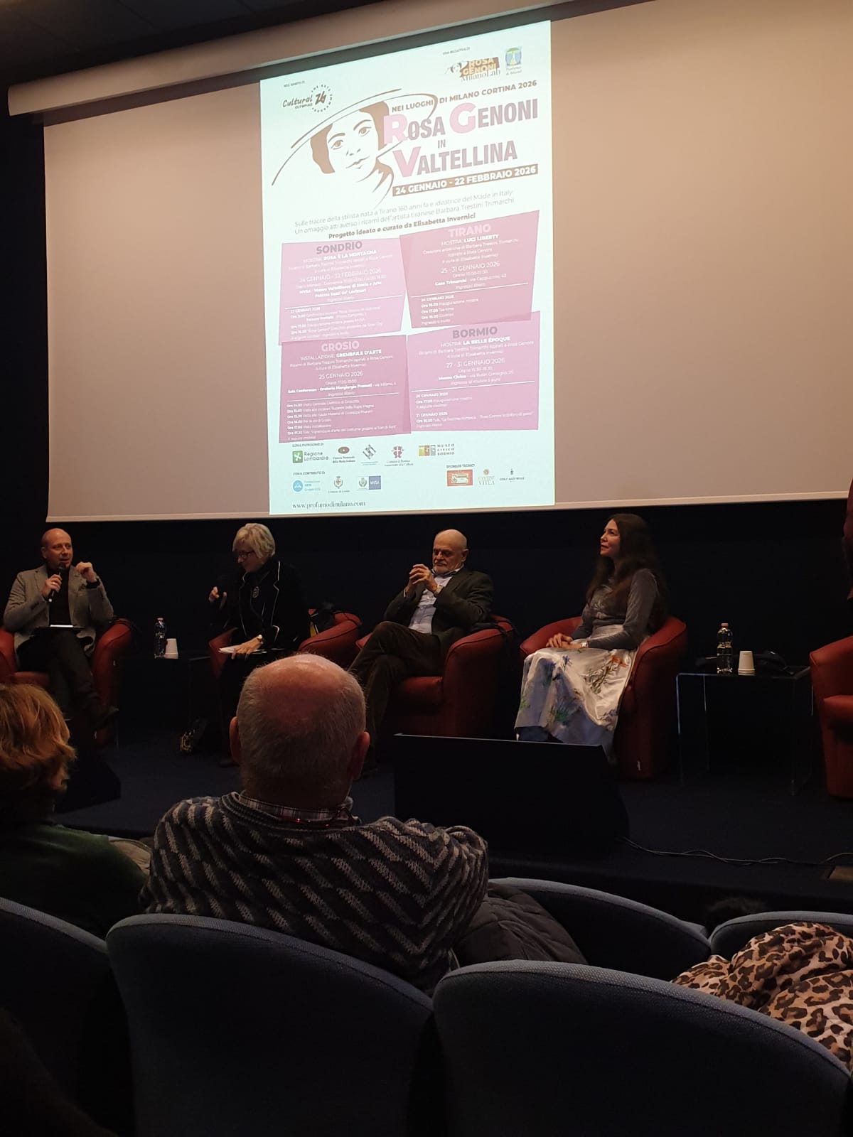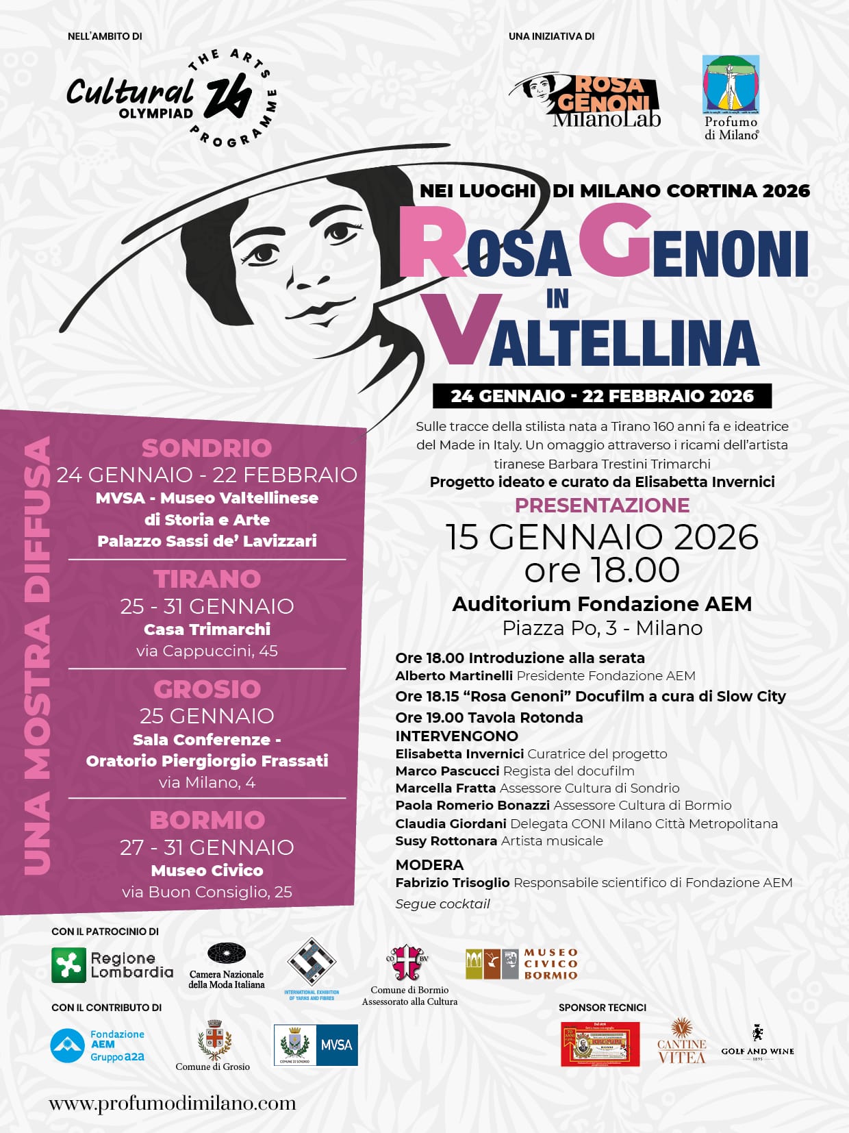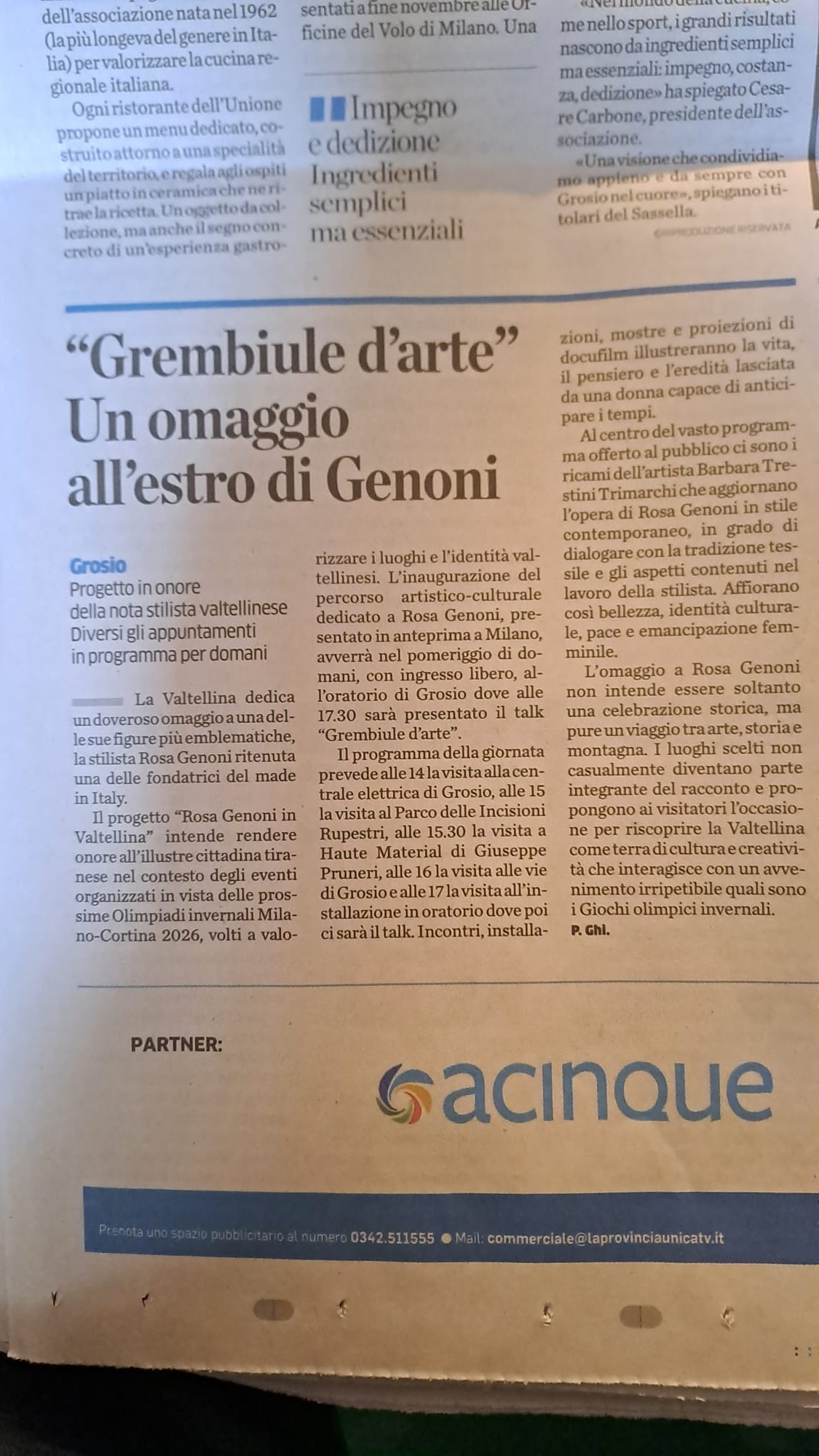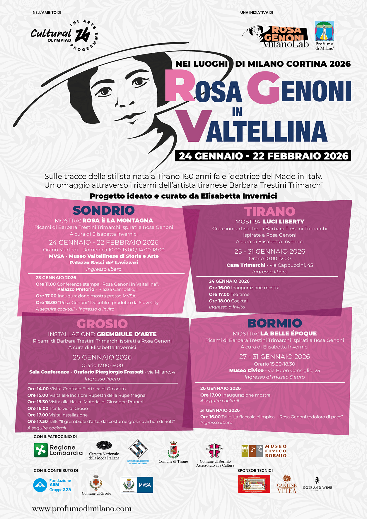 Susy Rottonara and the art aprons by ROTT with the installation of the Ladin legend of the Dolomites Merisana and the enchantement of flowers  ambassadors of the Cultural Olympiad d Milano Cortina 2026 within the festival Rosa Genoni in Valtellina