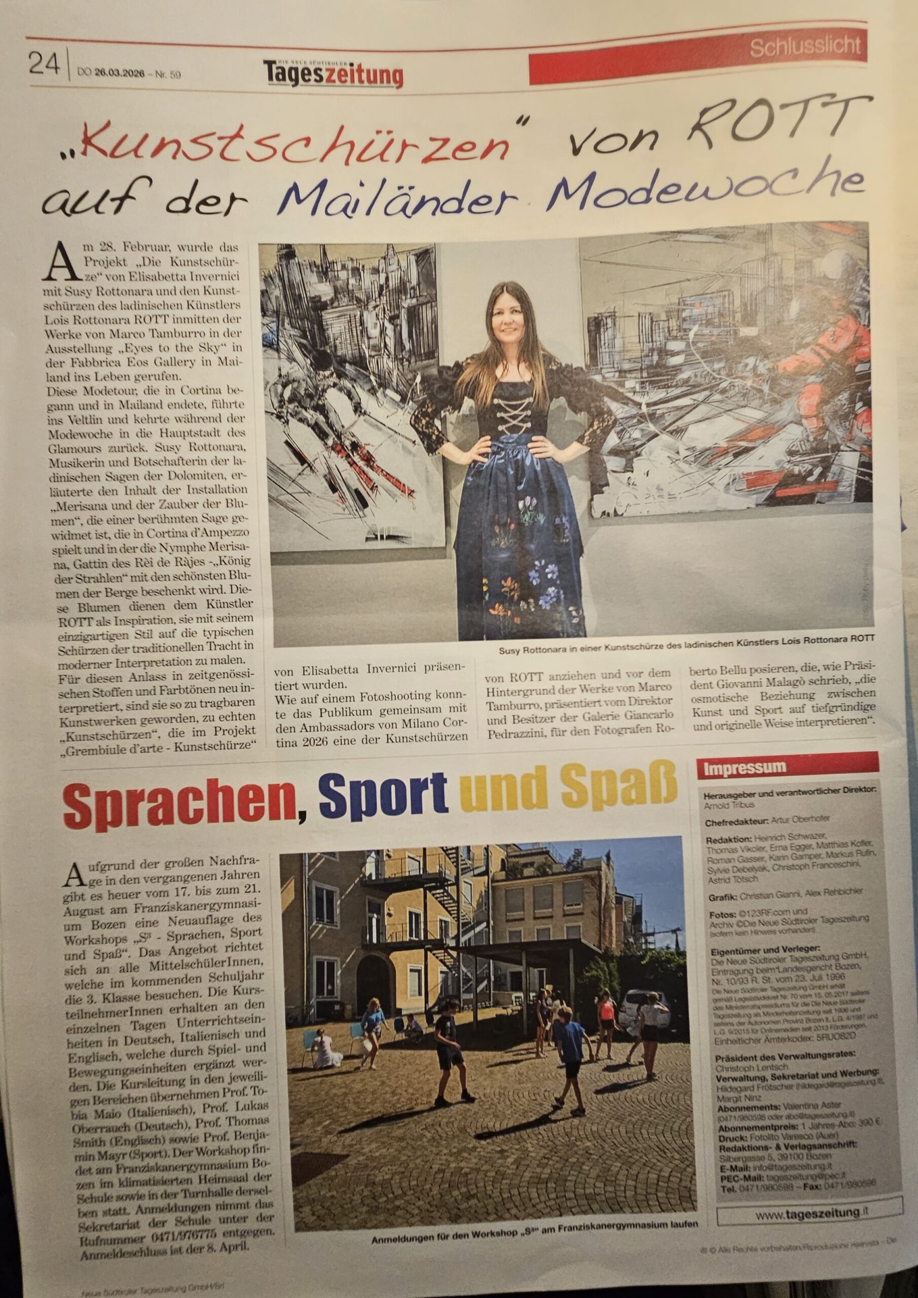 Evento dedicato al Grembiule d’arte di ROTT alla Fabbrica EOS Gallery nella mostra Eyes to the sky di Marco Tamburro nell’ambito dell’Olimpiade culturale Milano Cortina 2026 e della Milano Fashion Week. “Merisana e l’incanto dei fiori” con Susy Rottonara e “Il Grembiule d’arte” con la curatrice del progetto Elisabetta Invernici.